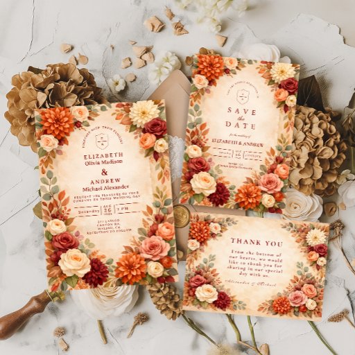 Inspired by lush autumn blooms and warm seasonal tones, this romantic wedding design features layered florals in shades of rust, blush, cream, and soft greenery. The painterly illustration creates a rich, elegant frame that feels timeless and inviting, perfect for celebrating love in the fall season.