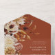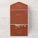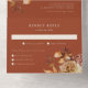 Copper - Autumn Floral Wedding All in One Invitation. This elegant all-in-one wedding invitation features hand-painted watercolor burnt orange and terracotta leaves, cream and beige dahlias, and beautiful rust-coloured roses on a copper background. RSVP with meal choice is included with this stylish invite. Find matching items in the Copper Autumn Romance Collection.