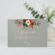 The Autumn Floral & Wreath RSVP - Sage features a botanical wreath, bride & grooms first initials and a wildflower bouquet in the beautiful colors of autumn on a sage background. The back has details for the recipient to fill out. Designed to coordinate with the "Floral & Foil Botanical Wreath" Wedding Collection. To change details, click «Personalize». To move the text or change the text size, font, or color click «Click to customize further» initials
