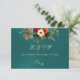 The Autumn Floral & Wreath RSVP - Teal features a botanical wreath, bride & grooms first initials and a wildflower bouquet in the beautiful colors of autumn on a teal background. The back has details for the recipient to fill out. Designed to coordinate with the "Floral & Foil Botanical Wreath" Wedding Collection. To change details, click «Personalize». To move the text or change the text size, font, or color click «Click to customize further» initials