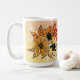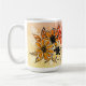 Whimsical flowers in gold, yellow, orange, red, black & white surround with leaves and accents cover this outside of this mug. Gold and Pink background. Also available in other sizes and a darker themed style. See our shop for options!