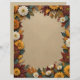Creamy white, golden yellow, coppery orange, and cocoa brown flowers, mixed with colorful autumn leaves on a dark tan background makes this stationery perfect for autumn.