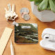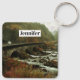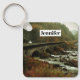 Personalized keychain with a nature photograph. Moody and beautiful landscape. A secluded stone bridge beside a lively river with a forest and mountains surrounding the area.