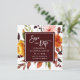 This wedding save the date square flat card features yellow, blush pink, orange watercolor flowers, and green, burgundy, brown leaves with a square frame.