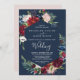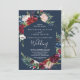 This autumn garden navy blue wedding invitation card is perfect for a fall wedding. The design features stunning blush pink, red, navy and burgundy watercolor flowers, blossoms and green leaves arranged in a lively fall floral frame.