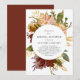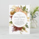 A lovely rustic bridal shower invitation featuring text in a white circle surrounded by a watercolor floral bouquet in autumn shades of paprika, orange, burgundy, brown, gold, pink, peach, rust, ivory, and cream. The reverse side is a matching shade of deep burgundy. Ideal for a fall or winter wedding. See our Autumn Garden Rustic Floral wedding collection for coordinating designs.