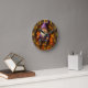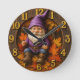 Autumn-themed wall clock featuring a whimsical purple gnome holding golden maple leaves in wooden frame. Fall decor with vibrant colours and gold numbers—perfect for cozy cabin or Thanksgiving gift.