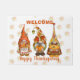 This design features the orange "Happy Thanksgiving" and "Welcome" text with three cute garden gnomes with pie, autumn leaves, and pumpkins.