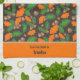 The Autumn Green and Orange Leaves Acorns Towel has bright green and orange leaves with brown acorns which pop against a deep brown background, bringing whimsical autumn charm to any kitchen. This personalized leaf autumn towel adds a playful “Leaf the Cookin” touch, making it a funny fall kitchen towel and perfect custom gift.