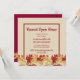 Harvest Open House invitation, with yellow and orange autumn foliage accents. with a beige and maroon background and beige and maroon lettering, you can customize with your own information. With a sample menu on the back, you can inform your guests the menu you are serving.