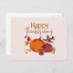 Celebrate the warmth of the Thanksgiving season with this charming postcard featuring an autumn harvest design. With vibrant pumpkins, seasonal leaves, and a jar of preserves, this card captures the essence of fall. The rich autumnal colours and elegant "Happy Thanksgiving" text make it perfect for sending holiday wishes to loved ones. Whether for family or friends, this postcard embodies the gratitude and joy of Thanksgiving.