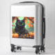 The black cat sits and watches all of the beautiful autumn leaves falling in the Halloween pumpkin patch.