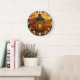 Serene autumn clock featuring a glowing vintage lantern encircled by crimson maple leaves at twilight. White numerals on warm-toned backdrop create cozy seasonal charm—perfect for Thanksgiving decor or cozy cabin ambiance.
