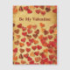 Multiple hearts, cut from fallen leaves, on a rustic, old paper background image. Customizable text reading, "Be My Valentine" also appears.