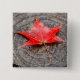 A single red autumn leaf resting on a log square button. It's time for autumn <3