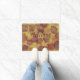 Warm and inviting doormat for the autumn season, decorated with the word, welcome, on a background of overlapping leaves in rich yellows and browns.