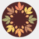 Yellow, orange, brown, and green maple leaves arranged in a circle on a deep brown background.