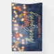 This customizable Thanksgiving banner is the perfect way to spread holiday cheer and warmth. A blend of autumn leaves in warm tones graces a blue wooden backdrop. Zigzagging warm white fairy lights add magic. "Thanksgiving" in elegant cursive centres the design, while below, a serif font accommodates your family name or message. Embrace the joy of a heartfelt celebration. 🍁🦃