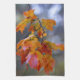 A close up look at some red and orange maple tree leaves with a blurred background.