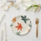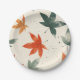 This illustration features a charming, minimalist pattern of autumn leaves in vibrant shades of red, orange, and muted green. The leaves are scattered across a soft beige background, with delicate splatters of black ink adding a touch of texture and artistic flair. The design captures the essence of fall, evoking a sense of warmth and natural beauty.