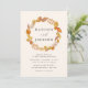 Elegant and rustic fall wedding invitations featuring a wreath of warm autumn leaves surrounding your names with your wedding details displayed below. The reverse side of the invite features a contrasting dark brown background colour.