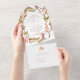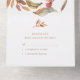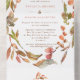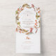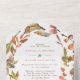 An autumnal rustic all-in-one wedding invitation with a watercolor wreath of leaves in green, terracotta and burgundy. The RSVP is a handy tearaway card.
