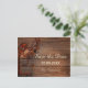 A lovely romantic Save the Date postcard featuring a tree with colourful leaves, roses and candle lit lanterns on a rustic wood background