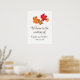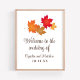 Greet your guests with this warm and inviting wedding welcome sign featuring a trio of vibrant red, orange, and gold maple leaves above elegant script text. The clean white background lets the colorful fall foliage and brown typography shine. Customize with the couple's names and date for a beautiful seasonal ceremony entrance display.