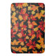 Autumn Midnight, display a vibrant pattern of autumn leaves against a black background. The leaves are a mix of bright red, orange, yellow, and gold hues, representing a variety of species like maple, oak and chestnut. `the contrast between the vivid colours of leaves and dark background creates a striking and dramatic effect, emphasizing the warm tones and intricate detail of the foliage. smaller leaves, acorns and twigs are scattered throughout, adding depth and texture to the pattern. The overall has design has an energetic and festive feel of a lively autumn night.