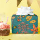 Autumn mushrooms, leaves, nuts and berries on blue wrapping paper