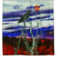 In a night sky with some clouds is a full moon that is red in colour and is rising above a grouping of mountains and hills. A crow is perched on a branch of a dead Birch tree looking out onto the forest of red leafed trees.