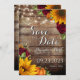 Autumn Pumpkin Rustic Save the Date Card. Announce your engagement in style with our Rustic Wedding Announcement Card. Features a brown wood background with greenery spread throughout, as well as yellow sunflowers, pumpkins and burgundy roses.