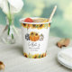 This design features three adorable pumpkins in orange, black and white plaid, and leopard print. Sunflowers and pumpkins encircle the edges of the cup on the top and bottom. The expectant mom's name in a handwritten cursive typography is featured along with "Baby Shower" and the date.