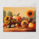 Pumpkins of many colours surrounded by beautiful sunflowers with a tree lined background.