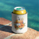 Can cooler with a fall themed image. Orange and white pumpkins surrounded by fall leaves and orange flowers.