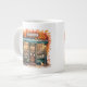 Warm autumn café storefront with vibrant orange leaves, books visible through the window, outdoor chairs and a cat sitting by the entrance. A charming seasonal mug for book lovers, teachers, students, and fans of cozy fall reading culture