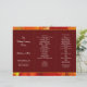 Custom, Fall wedding program template. Dark burgundy coloured centre panel over a background of orange and yellow fall leaves. White text is easy to customize by section on a three-way folded paper. Images and text are printed on ONE SIDE ONLY. Felt paper is shown and can be changed.