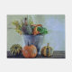 a photo of a fall harvest scene with various Halloween decorations. It shows a wooden table with a white tablecloth, on which there are several pumpkins, gourds, corn cobs, candles, and a lantern. Behind the table, there is a wooden fence with some dried leaves and vines. The background is blurred, but it seems to be a rural landscape with some trees and fields. The photo has a warm and cozy atmosphere, with orange and yellow tones dominating the colour scheme