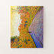 A woman takes a walk down a road lined with trees ablaze with fall foliage on this beautiful jigsaw puzzle.