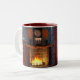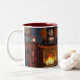 A cozy reading corner on a rainy autumn day. Around the hearth with a blazing fire are cushy red armchairs, with stacks of books and teacakes and a teapot to complete the comfort. Outside a yellow willow and red maple and beech hedge are obscured by the blowing rain, which sprinkles the window where a ginger cat sits looking out.
