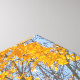 The image showcases trees with vibrant yellow leaves in an urban setting. The trees are in the foreground, with a tall building visible in the background. The sky is a clear blue, providing a contrasting backdrop to the autumn colours. The scene evokes a sense of tranquillity amidst the city environment. The composition emphasizes the beauty of nature within an urban landscape.