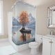 Two small trees in orange autumn foliage sits on a rocky island in the middle of a lake in the mountains on this beautiful shower curtain.