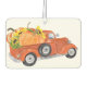 Old fashioned orange pick-up truck carrying giant pumpkins and sunflowers in the back.