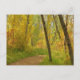 A photograph of a walking trail through autumn coloured trees of yellow and some green