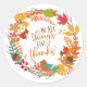These Thanksgiving themed stickers feature the script "In All Things Give Thanks" inside a pretty autumn wreath. The wreath is made of brown, gold, and crimson leaves, seed pods and branches, with a little bird at the bottom.