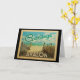 This Greetings From Avalon vintage postcard design features a sandy beach with a beautiful turquoise ocean water and above the sea, a blue sky with billowy white clouds. In vintage travels style.