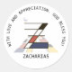 Handsome, funny, artistic monogram. Here is the letter "Z". Neoplasticism style, or De Stijl, line and colour artistic decoration, the funny bird sits on the letter. The field of art is located under the letter. The template name "ZACHARIAS" is located under the image. "With love and appreciation. God bless you!" text goes around the image. You can change or delete all the texts, and you can change the image. Unique, one-of-a-kind sticker for you. You can transfer this design to a number of products. Feel free to use the "Edit Design" or "Personalize" (as the case may be) button of the blue colour to change the font, colour, or position of the image and the template text. Be creative, customize, buy one, and be happy!