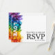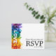 Cette belle carte de boîtier RSVP fait partie de la collection Painted With Love LGBTQ+ Mariage. Conçu pour compléter le faire-part de mariage, la carte horizontale comporte une cascade vibrante de coups de pinceau imprégnés d'arc-en-ciel qui descendent le côté gauche, avec le mot "LOVE" placé audacieusement verticalement pour attirer l'oeil. Le dos de la carte est conçu pour que vos invités puissent répondre facilement. Il fournit une ligne pour qu'ils écrivent leur nom, suivie par des cases à cocher pour indiquer s'ils "acceptent avec plaisir" ou "regrettent" et un espace pour spécifier le nombre d'invités. Un élément clé de cette carte est l'option pour les clients de choisir leur choix de repas dans une liste personnalisable, comme "saumon grillé avec sauce au citron-aneth", "filet mignon avec réduction de vin rouge" et "poivrons farcis végétariens". En outre, le bas de la carte comprend un code QR que les clients peuvent scanner pour répondre en ligne, ce qui rend le processus RSVP simple et moderne. Le verso de la carte est simple avec le texte "S'il vous plaît, aidez-nous à planifier et RSVP", suivi de la date limite de réponse clairement indiquée en bas.