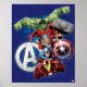 Check out Hulk, Thor, Captain America, and Iron Man stacked vertically in this high tech style graphic, featuring the Avengers Logo with starburst lighting.