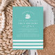Naviguez pour la plus grande aventure de votre vie ! Notre invitation au baby shower nautique douce dans une palette de couleurs neutres d'aqua blanc et turquoise présente une illustration de bateau avec "l'aventure attend" en lettres modernes, en surmontant vos détails de l'événement. Une bande blanche rayée le long du fond complète le design. Les cartes retournent à un motif d'ancre nautique en aqua et blanc.